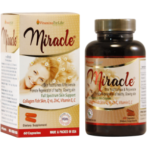 Sản phẩmViên đẹp da Miracle -với tính ưu việt bởi công thức mới nhất tập trung nuôi dưỡng làn da, hiệu quả nhanh trong việc làm trẻ hóa da, chăm sóc da từ sâu bên trong, Sản phẩm được bào chế bởi Vitamins For Life Laboratories (New Jersey – Mỹ) Không chỉ có Collagen da cá biển, viên uống dưỡng da Miracle còn chứa Coenzyme Q10, vitamin C, E, Kẽm sinh học, MSM, và các tinh chất từ thiên nhiên theo công thức chống lão hóa da đặc biệt giúp da khỏe, đẹp căng mịn, tự tin hơn bao giờ hết – Miracle – giúp cho mơ ước “trẻ mãi không già” của phụ nữ trở thành hiện thực.